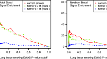 The primary analysis was conducted in a study of only current smokers in Hawaii. The study has been described in detail previously [4, 41]. In brief, 612 smokers were randomly identified from either the Hawaii component of the Multiethnic Cohort study (MEC) (87%) or control groups of population-based case-control studies conducted in Hawaii (13%). The MEC is a prospective study of > 215,000 men and women of five racial/ethnic groups: African Americans, Japanese American, Native Hawaiian, Latinos, and whites, recruited from the state of Hawaii and from Southern California, primarily Los Angeles County, between 1993 and 1996 [42]. For the present study, eligible participants were identified among those who reported smoking at least 10 CPD on their respective study questionnaire, have had no previous history of cancer, and whose parents are both of Japanese or both of Caucasian ancestry or for whom one or both parents have any amount of Native Hawaiian ancestry. To confirm previously published associations between smoking status and DNA methylation, 35 randomly selected never smokers from the MEC (n = 12 Native Hawaiians, 11 Japanese Americans, and 12 whites) were included in the EWAS of smoking status. Never smoking status was identified by self-report at time of biospecimen collection.