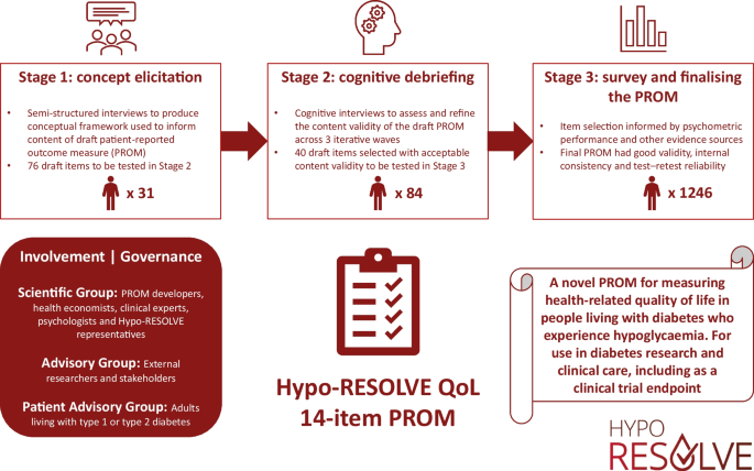 The hypoglycaemia health-related QoL measure (Hypo-RESOLVE QoL) was developed following best practice (Fig. 1) [7, 11], involving a series of studies with people with diabetes. This included qualitative work eliciting a comprehensive understanding of hypoglycaemia-related HRQoL impacts on people with diabetes, further qualitative work refining the draft PROM and an assessment of its psychometric performance in a large sample of individuals with diabetes. The work had three governance groups involved at key stages, including: an Advisory Group of researchers and stakeholders external to the Hypo-RESOLVE Consortium; a patient advisory committee (PAC) comprising adults living with type 1 or type 2 diabetes and representatives from the IDF and JDRF drawn from Hypo-RESOLVE patient advisors (https://hypo-resolve.eu/network/advisors); and a Scientific Group comprising PROM developers, health economists, clinical experts and stakeholder representatives from the wider Hypo-RESOLVE Consortium.