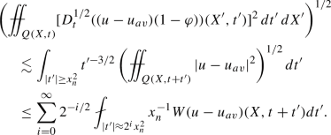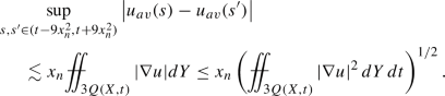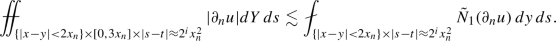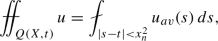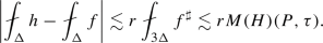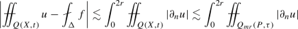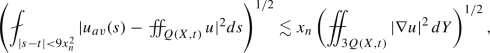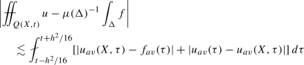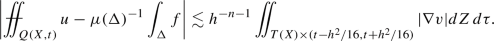 where \(f_{av}=\sigma (\tilde{S}(X))^{-1}\int _{\tilde{S}(X)} f\,d\sigma \). We now use this on the time-slices \(Q(X,t)\cap \{\tau =const\}\) for \(\tau \in (t-h^2/16,t+h^2/16)\), integrate in \(\tau \) and average. Let \(\Delta \) be the set \(\tilde{S}(X)\times (t-h^2/16,t+h^2/16)\) any \(\mu \) the product measure \(d\mu =d\sigma \, dt\). It follows that