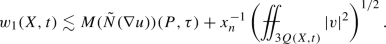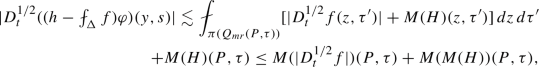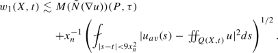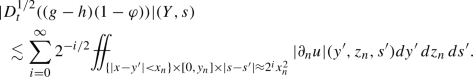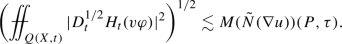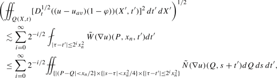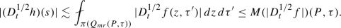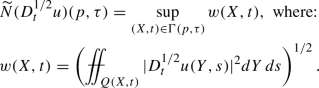 We finish our argument by recalling that \(w(X,t)\lesssim w_1(X,t)+w_2(X,t)+w_3(X,t)+w_4(X,t)\) and hence by just finished calculation, (3.13), (3.15), (3.21) and the estimate above we get for \(\tilde{N}(D^{1/2}_tu)(P,\tau )=\sup _{(X,t)\in \Gamma (P,\tau )}w(X,t)\):