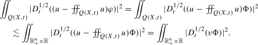 Here we denote by Q(X, t) the parabolic region \(Q(X,t)=\{(Y,s):|X-Y|<\delta (X,t)/4\, \text{ and } \,|s-t|<\delta ^2(X,t)/16\}\). We note that the \(\delta (X,t)=x_n\) is the distance of the point to the boundary. Here the shape of the region surrounding the point (X, t) does not matter as long as it contains and is contained in parabolic balls centered at (X, t) of diameter \(\approx \delta (X,t)\). The choice of \(\delta (X,t)/4\) and \(\delta (X,t)^2/16\) is just for convenience so that an enlargement \(3Q(X,t)\subset \subset \Omega \).