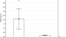 Ten grams of soil were weighted from each sample, and then polycyclic aromatic hydrocarbons were extracted from these amounts with 70 mL of 2-propanol. The samples were centrifuged (4500, 5 min), and the supernatant was collected. The supernatants were extracted to solid phase (5 mL min−1)—solid-phase extraction (Chromabond Cn/SiOH). The residue was dissolved in acetonitrile and analyzed with the HPLC method. The Dionex UltiMate 3000 HPLC system was equipped with a fluorescence detector (FLD) and Dionex UltiMate 3000 Column Compartment—C18 5 μm, 4.6 × 100 mm HPLC column. The mobile phase was water (A) and acetonitrile (B) at a flow rate of 1 mL min−1. From the standard PAH Calibration Mix (CRM 47940) at a concentration of 10 μg mL−1, the calibration solution at different concentrations (i.e., 0.1, 0.2, 0.5, 1, 2 μg mL−1) was prepared. Each of the prepared solutions was dispensed to a chromatography column—obtained chromatograms designated the calibration curve. Then the soil samples in triplicate were dispensed. After each 9th analysis, the “unknown” sample (calibration solution with a concentration 0.1 μg mL−1) which was control material was injected. Twelve priority PAHs were determined: acenaphthylene (Acy), phenanthrene (Phe), fluoranthene (Flt), pyrene (Pyr), benzo(a)anthracene (BaA), chrysene (Chr), benzo(k)fluoranthene (BkF), benzo(b)fluoranthene (BbF), benzo(a)pyrene (BaP), indeno(1,2,3-c,d)pyren (IcdP), dibenzo(a,h)anthracene (DahA) and benzo(g,h,i)perylene (BghiP). The sum of PAHs was calculated (12 priority PAHs content was added). The sum of PAHs was calculated for soils in different localizations, under different forest stands. Diagnostic ratios have been used to distinguish the emission sources of PAHs, ΣLMW/ΣHMW (Soclo et al. 2000), Flt/(Flt + Pyr) (Yunker et al. 2002), Flt/Pyr (Baumard et al. 1999) and IcdP/(IcdP + BghiP) (Kwon and Choi 2014). The LMW/HMW ratio was calculated by the sum of low molecular weight PAHs with 3–4 rings and the sum of high molecular weight PAHs with 5–6 rings.