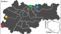 The study was conducted in southern Poland. Krakow was the central point around which the test surfaces were designated (Fig. 1). In the forest complexes, arranged in four directions around Krakow 48 research plots were established. They included four directions of the world W, E, S and N in the two distances 15 and 35 km from Krakow, three surfaces in the stands of broadleaf trees (80- to 90-year-old oak stands) and three surfaces in the stands of coniferous trees (80- to 90-year-old pine stands). The main sources of pollution in Krakow are the steel producer ArcelorMittal Poland Unit in Krakow, power station “Łęg” and Krakow pharmaceutical company. In addition, the pollution is increased by passenger planes (Balice airport) and road traffic (Krakow is situated on the route from Medyka to Zgorzelec) (Fig. 1). In addition, significant amounts of pollutants are transferred from the Upper Silesian Industrial Region, mainly due to the dominance of western winds (Fig. 1). The test area was dominated by Cambisols and Luvisols (IUSS Working Group WRB 2006).
