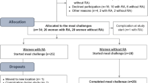The vegan group also showed significantly lower levels of CRP, a physiologic marker of subclinical inflammation, which has been shown to be associated with insulin resistance and CVD [57, 58]. Elevated levels of CRP have been suggested to reflect overproduction by expanded adipose tissue mass [57]. In line with our previous findings [19], both DAS28 and HAQ decreased in the vegan group whereas only DAS28 at 3 months decreased in the control diet group.