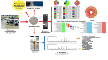 VP-BSD SEM imaging at low magnification showed a different pattern of salts distribution on the parchment surface in core samples taken from damaged and healthy areas; salts dislocation occurred more frequently on the damaged surface than the healthy one (Fig. 4a, b). The appearance of the stained and degraded samples indicated that the microbial attack was associated with the loss or consumption of the outer layers of the parchment. The lyses of collagen fibers and a profound structural damage was documented by HV-SEM imaging on both the flesh and hair sides of the core sample taken from the purple stained areas of the folio. This showed that the organism that caused the damage was actually using collagen as carbon source (Fig. 5a, b). The observation of gold coated samples by means of SEM in high vacuum mode showed the presence of both bacterial and fungal cells between the collagen fibers (Figs. 6 and 7). In these images, a huge number of bacterial cells were observed, compared to only a few echinated fungal conidia that were present (Figs. 6b and 7a). Bacterial cells (less than 1 μm in diameter) documented by SEM form chains that are morphologically consistent with the genus Nocardiopsis, which was also identified by molecular methods. Nocardiopsis was described by Meyer [68] and is a genus of aerobic actinomycetes that includes several species [69]. It includes moderately halophilic species capable of producing alkaline proteases [70]; some species also produce red to deep orange pigments [71]. A detailed picture of the prevailing morphology of the filamentous bacteria that occur in the manuscript is reported in Fig. 6a. The filaments that appear coarsely wrinkled are often branched and fragmenting into spores (Fig. 7a, b). Aerial filaments are well developed and abundant. Some chains of bacterial cells were also found adhered to intact collagen fibers as showed in Fig. 5b. The three sample cores of parchment (healthy and damaged) were very small when compared to the folios of the manuscript and therefore not very representative of the whole object. Despite the difficulties presented by the uniqueness of the object, its value and the ethical and practical problems linked to sampling, it became quite clear from the SEM images, that the damage is linked to an attack by an apparently unique species of filamentous bacteria rather than to the presence of filamentous fungi. The few fungal cells that were found in SEM images taken of the entire surface of the available sample appeared in chains, echinated, and covered with bacterial filaments (Figs. 6b and 7a). This suggests that (a) the fungi present on the damaged samples may correspond (according to shape, ornamentation, and dimension), among those found with molecular techniques, to a Penicillium or an Aspergillus species and (b) the fungi grew on the parchment before or together with the collagenolytic bacterium.