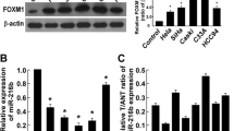 It has been identified that miR-150 targets the 3′UTR of multiple genes which play important roles in cell proliferation, clonogenicity, invasion, intercellular adhesion, and apoptosis. In gastric cancer cells, miR-150 promotes cell survival by repressing the transcription of EGR2, a pro-apoptotic gene [12]. miR-150 also targets the 3′UTR of p53 and thus regulates its expression, leading to cell survival [14]. 3′UTR of pro-apoptotic purinergic P2X7 is targeted by miR-150 in breast cancer cells [18, 35]. Our work identified FOXO4 as a novel target of miR-150 as miR-150 suppressed the transcriptional process of FOXO4 through targeting the 3′UTR of its mRNA. FOXO4, a member of the class O of forkhead box transcription factors (FOXOs), is an important downstream target of the insulin-phosphatidylinositol 3-kinase (PI3K)–serine–threonine kinase AKT/protein kinase B (AKT/PKB) signaling pathway which can protect cells against apoptosis [19]. Enforced FOXO4 activity induces apoptosis through regulation of various pro-apoptotic genes, such as FASL, BIM, Bcl-6, and PUMA, and modulates cell cycle progression through influencing p27, p130Rb2, CyclinD1, and CyclinG2 [19]. Since miR-150 overexpression modulates the expression of CyclinD1, p27, FASL, and BIM, it is possible that these regulation is caused by miR-150-mediated FOXO4 targeting (Fig. 5d).