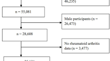 The calculation of the RC is a process that entails determining its specific value by subtracting both the HDL-C and LDL-C values from the TC value. Consistent with the previous investigation [21,22,23], arthritis was diagnosed in the participants using a self-report questionnaire and the following question: “Have you ever been informed by a healthcare professional that you have arthritis?” The participants were given two response options: “yes” or “no”. Participants with a “yes” response were asked to specify the type of arthritis diagnosed. This information enabled the classification of arthritis into distinct categories, including but not limited to OA, RA, and other forms of arthritis. A prior study established that the accuracy of self-reported OA and RA is deemed acceptable for large-scale studies [24].