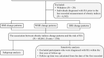 Wesley A, Bengtsson C, Elkan AC, Klareskog L, Alfredsson L, Wedren S, et al. Association between body mass index and anti-citrullinated protein antibody-positive and anti-citrullinated protein antibody-negative rheumatoid arthritis: results from a population-based case-control study. Arthritis Care Res. 2013;65:107–12.